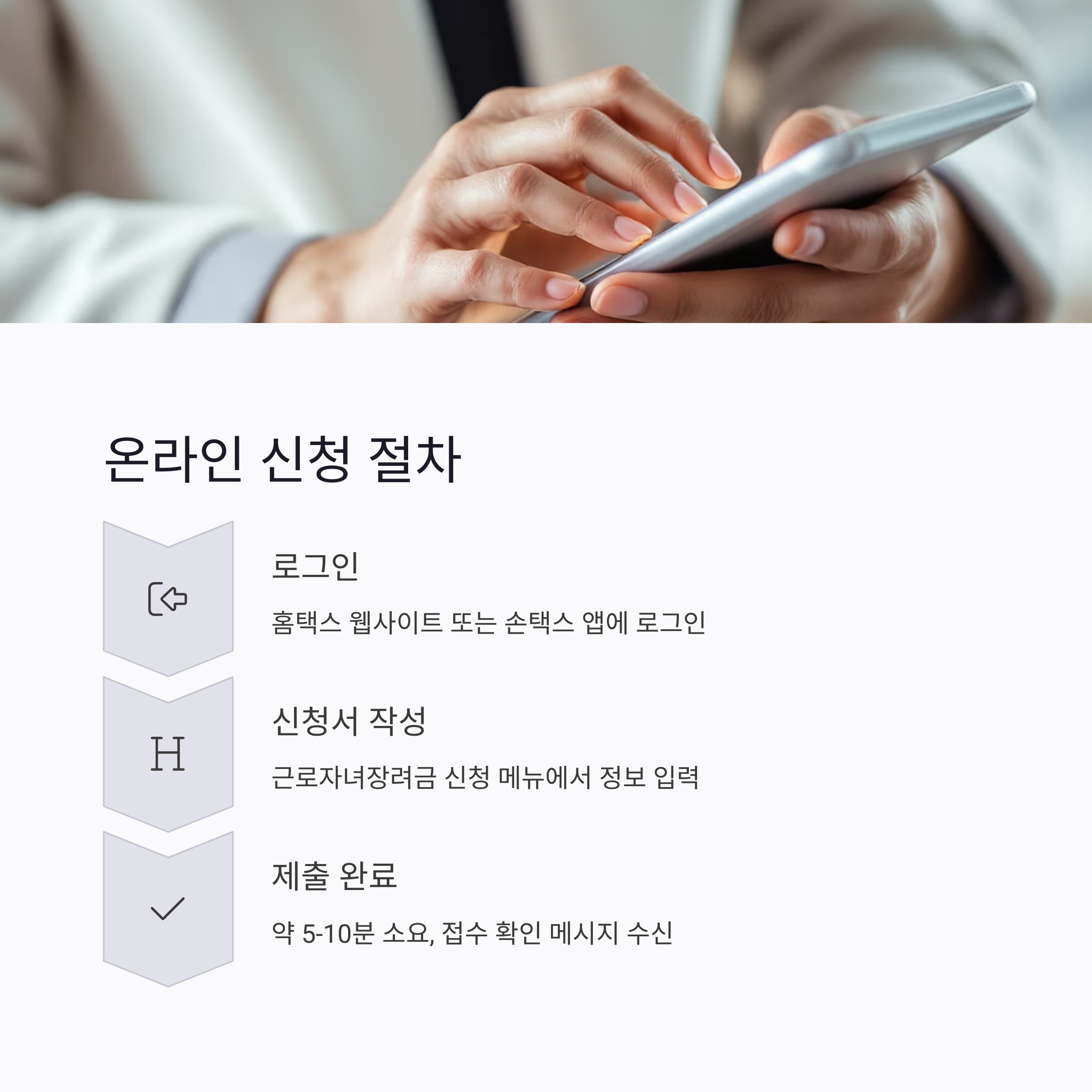 | 손택스 앱 | 앱 설치 → 로그인 → 신청서 작성 → 제출 | 약 5분 |