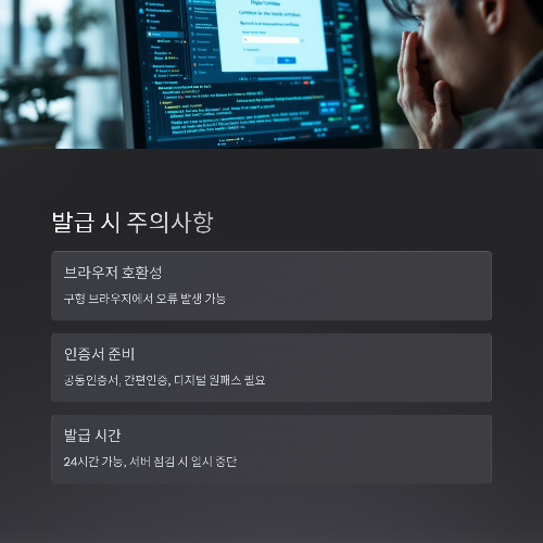 - 발급 시간: 발급은 24시간 가능하지만, 간혹 서버 점검으로 일시적 중단이 있을 수 있습니다.