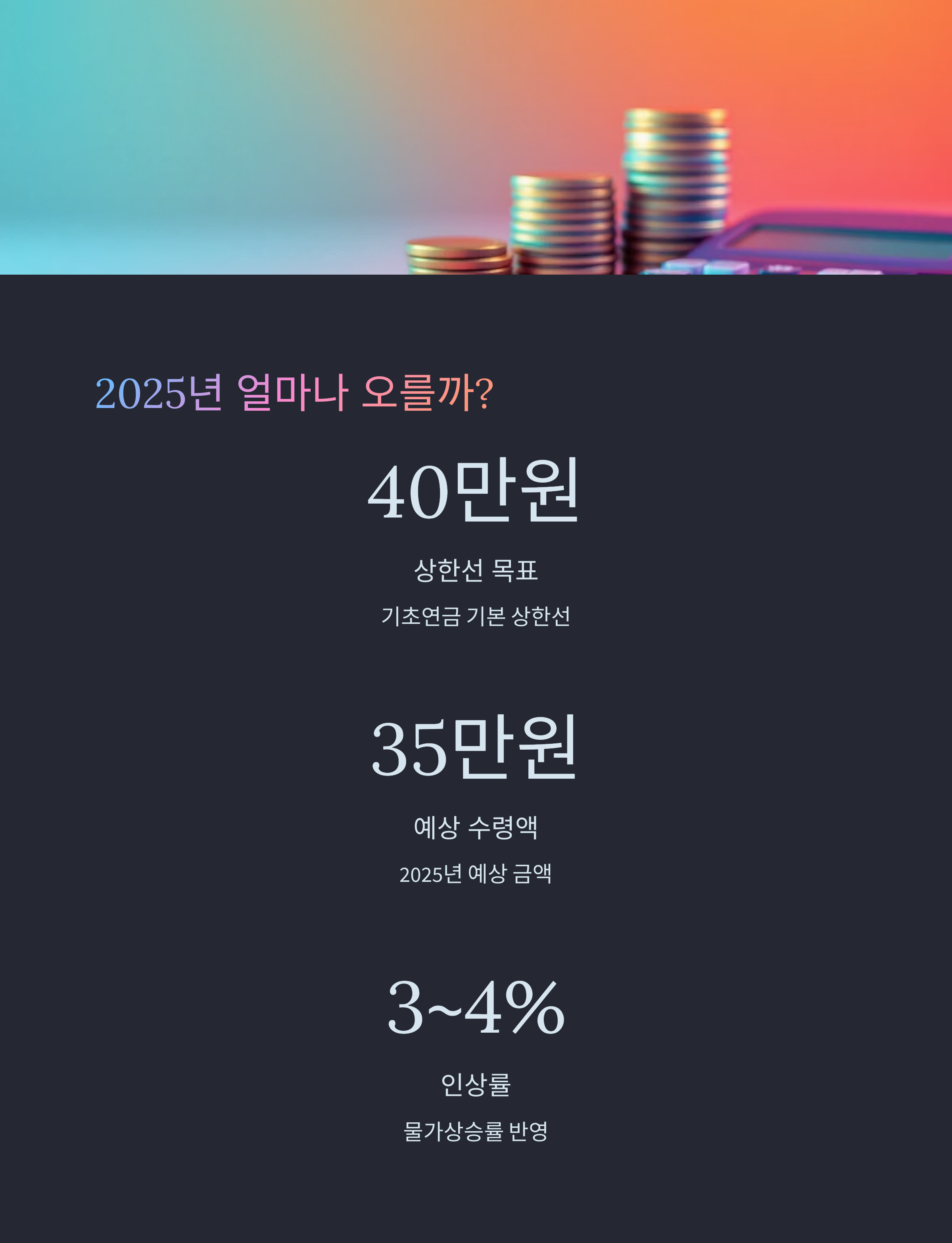2025년 기준 기초연금은 기본 40만 원 상한선에 근접하는 방향으로 논의되고 있습니다