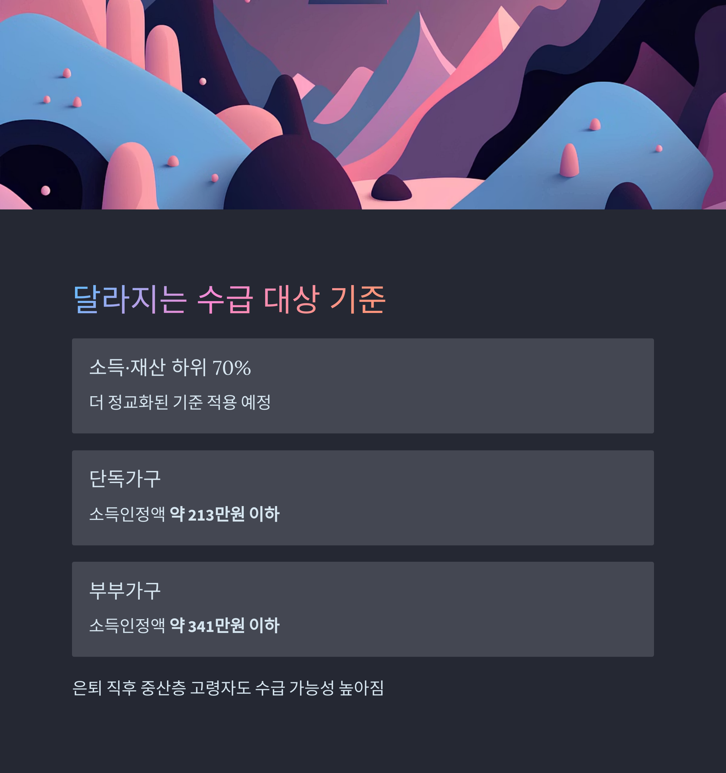 즉, 은퇴 직후의 중산층 고령자도 일부 수급 가능성이 높아질 수 있습니다