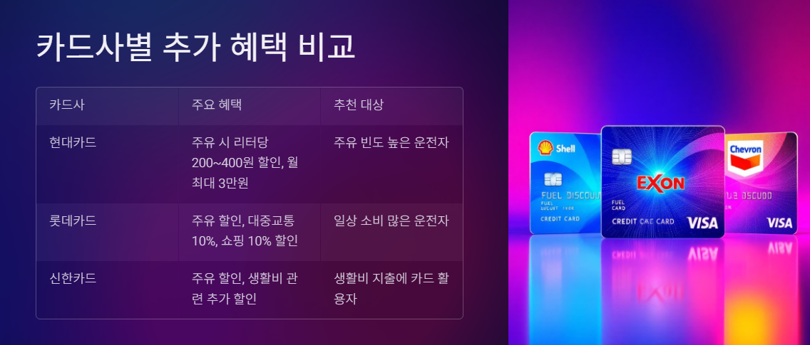 각 카드사는 유류세 환급 외에 추가 혜택을 제공하므로, 본인의 소비 패턴에 맞는 카드를 선택하는 것이 좋습니다. 아래는 주요 카드의 특징입니다