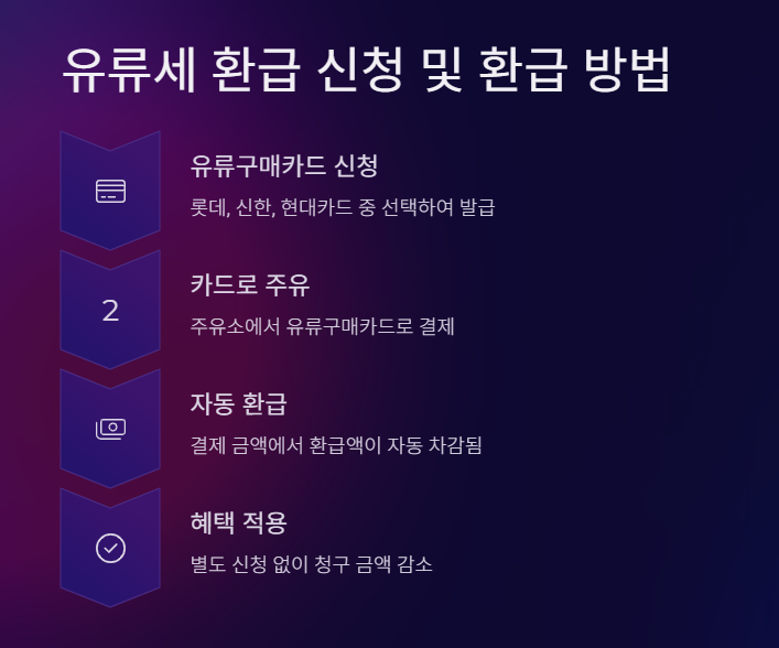 - 주유소 또는 LPG 충전소에서 유류구매카드로 결제하면, 카드사가 결제 금액에서 환급액(리터당 250원 또는 161원)을 차감하여 청구합니다. 별도의 환급 신청은 필요 없습니다.