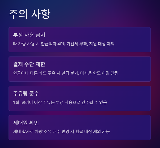- 제한된 결제 수단: 현금이나 다른 카드로 주유한 경우 환급 불가하며, 미사용 환급 한도는 다음 연도로 이월되지 않습니다.