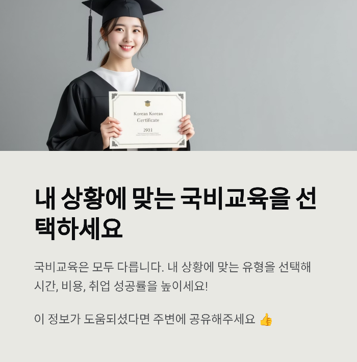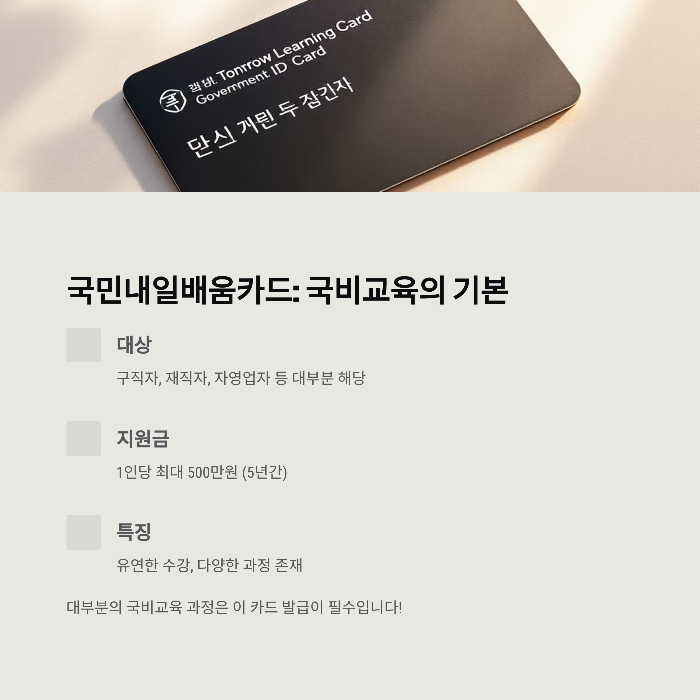 | 국민내일배움카드 | 전 연령, 재직/구직 모두 | 일부 과정 가능 | 입문자, 직무 전환자 |