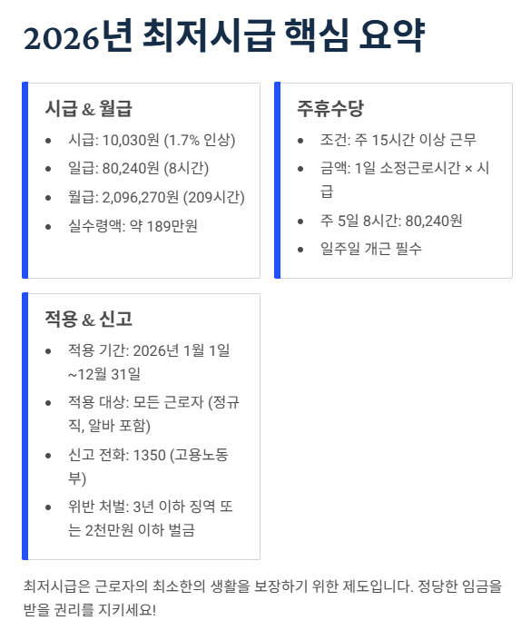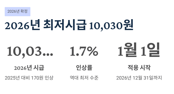 - 2026년 최저시급: 10,030원 (1.7% 인상)