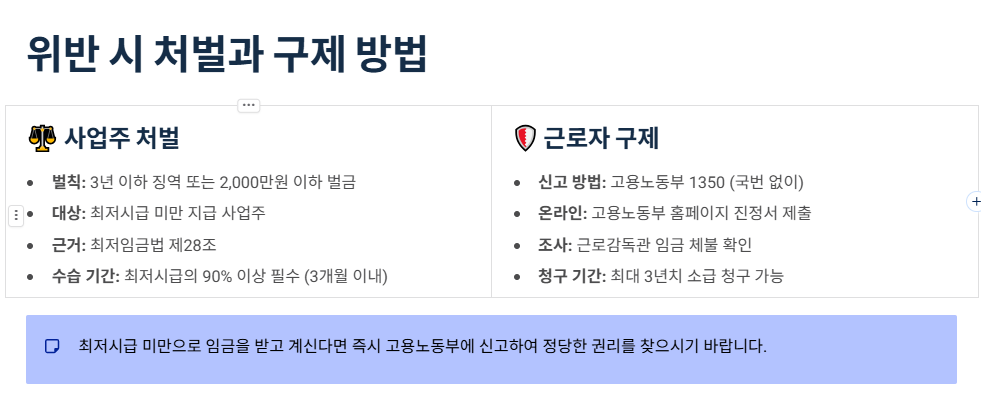 최저시급은 근로자의 최소한의 생활을 보장하기 위한 제도입니다. 최저시급 미만으로 임금을 받고 계신다면 즉시 고용노동부에 신고하여 정당한 권리를 찾으시기 바랍니다.