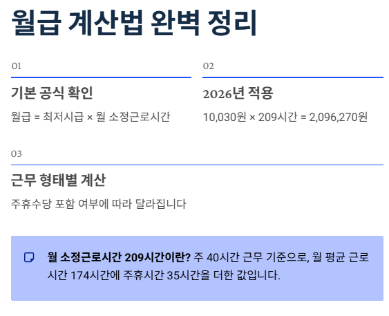 | 월급 (209시간) | 10,030원 × 209시간 | 2,096,270원 |