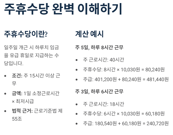 - 주휴수당: 주 15시간 이상 근무 시 지급