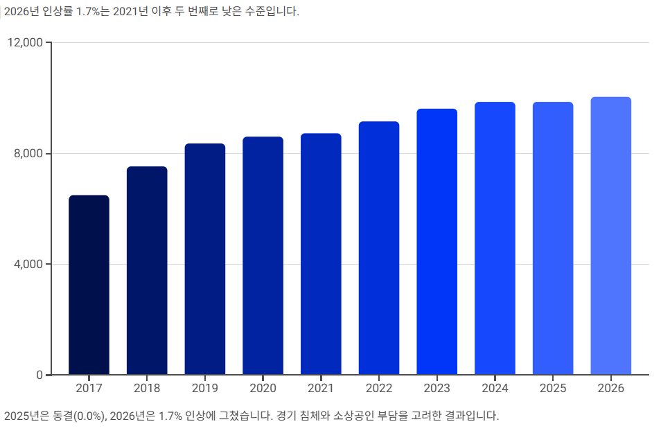 2026년 최저시급 인상률은 1.7%로 역대 최저 수준입니다.