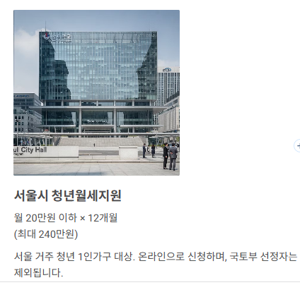 - 서울 거주 청년 1인가구 등 대상, 월 20만원 이하 지원(최대 12개월/240만원) (seoulhousing.kr)