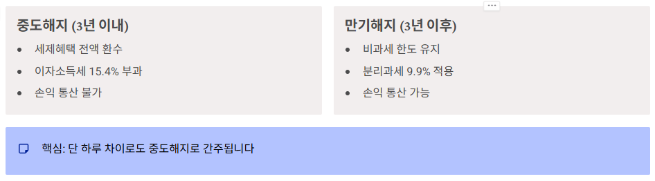 - 중도해지 (3년 내): 모든 혜택 박탈, 15.4% 원천징수