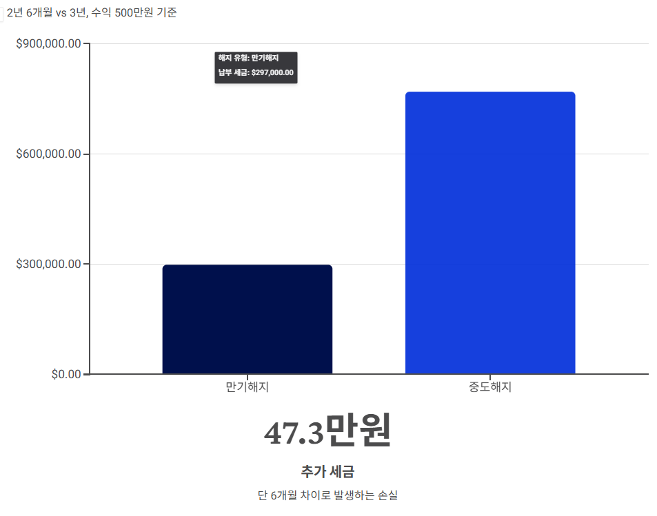 결론: 단 6개월 차이로 약 47만원의 추가 세금! 가능하면 3년을 채우는 것이 필수입니다.