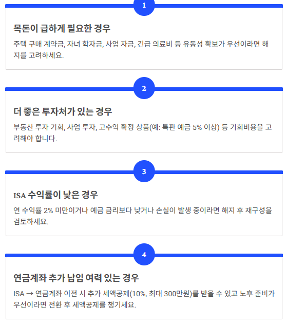 ISA 계좌는 3년 만기 후 연장 가능! 연장 시 비과세 한도가 추가로 제공되고, 계좌 유지 시 세제 혜택 지속. 단, 목돈이 급하게 필요하거나 더 좋은 투자처가 있다면 해지도 고려해야 합니다.