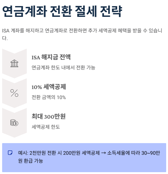 - ISA에서 연금계좌로 이전 시 10% 세액공제 (최대 300만원)