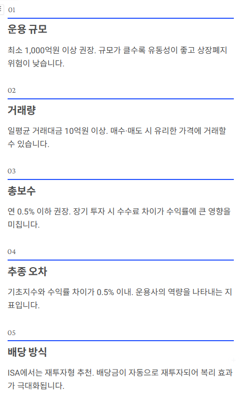 ISA 계좌에서 투자할 ETF를 선택할 때는 다음 기준을 고려해야 합니다.