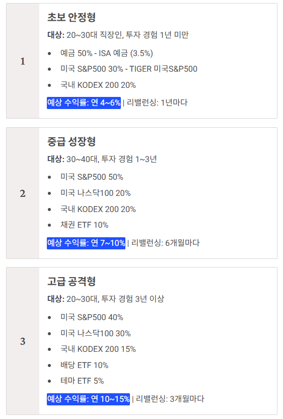 - 중급자: S&P500 50% + 나스닥100 20% + KODEX 200 20% + 채권 10%