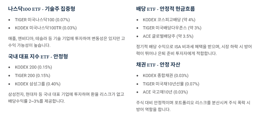 ISA 계좌에서 장기 투자하기 좋은 ETF를 유형별로 추천드립니다.